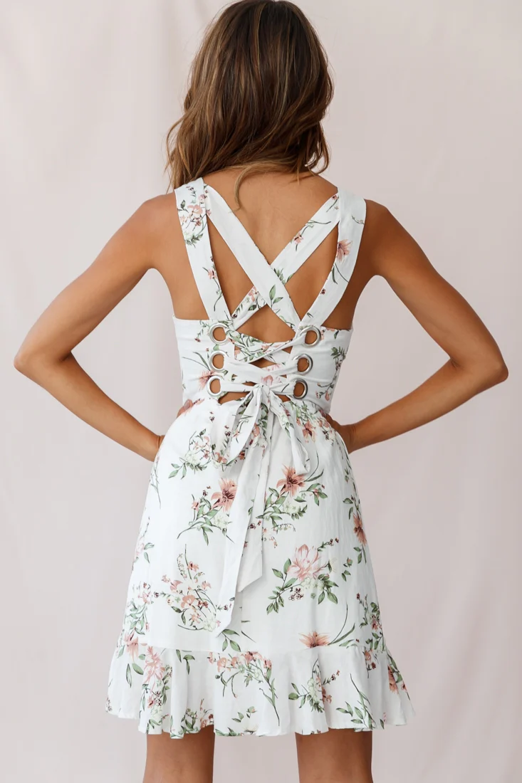 Taj Lace-Up Back Asymmetrical Hem Dress Floral Print White