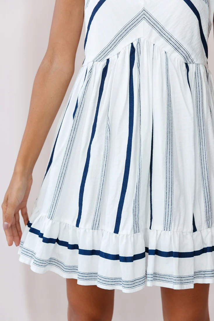 Elsie Square Neckline Frill Hem Swing Dress Stripe Print Navy