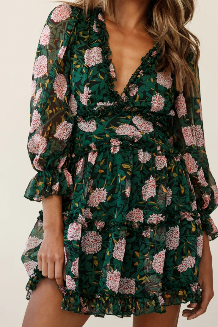 Laney Cutout Back Ruffle Trim Dress Floral Print Green
