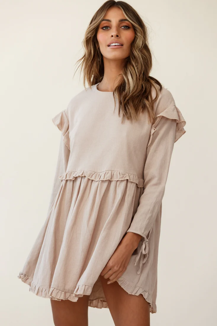 Mildred Long Sleeve Shirred Waist Frill Dress Nude