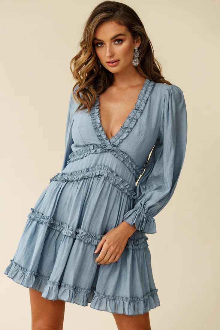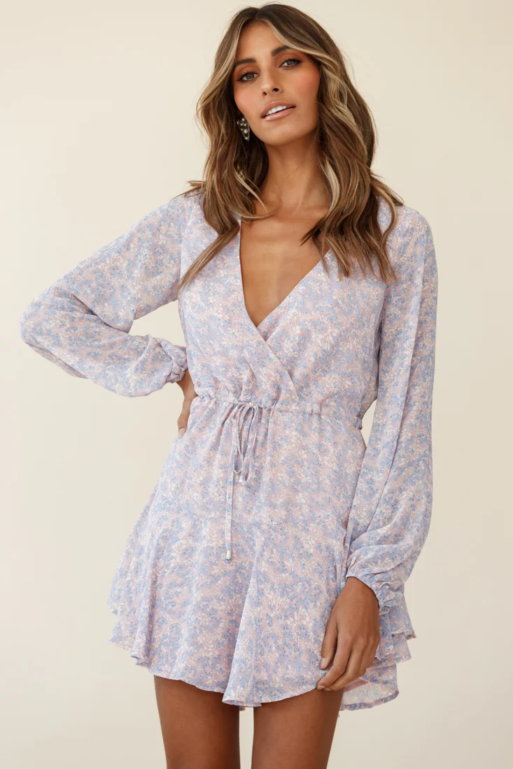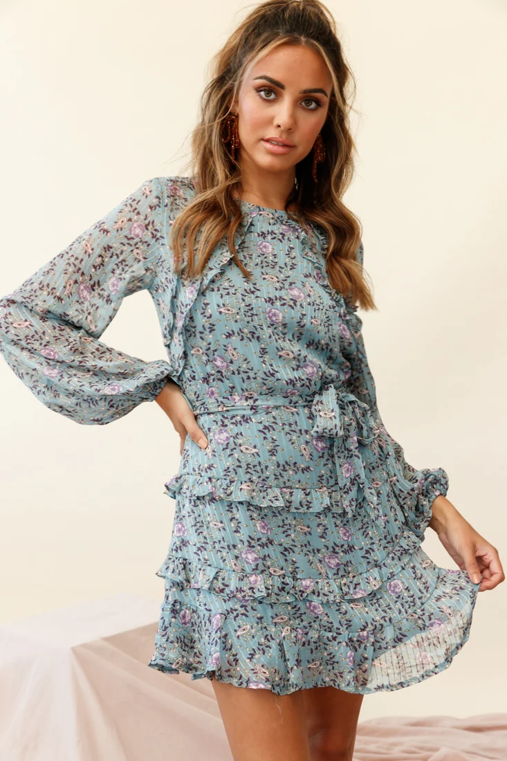 Dusk Long Sleeve Waist Tie Frill Dress Floral Print Midnight Blue