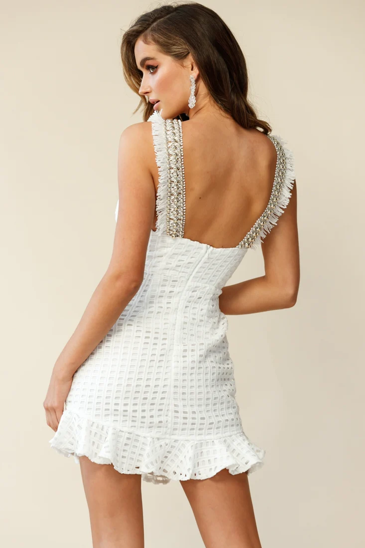 Argyle Bead & Fringe Trim Ruffle Hem Dress White