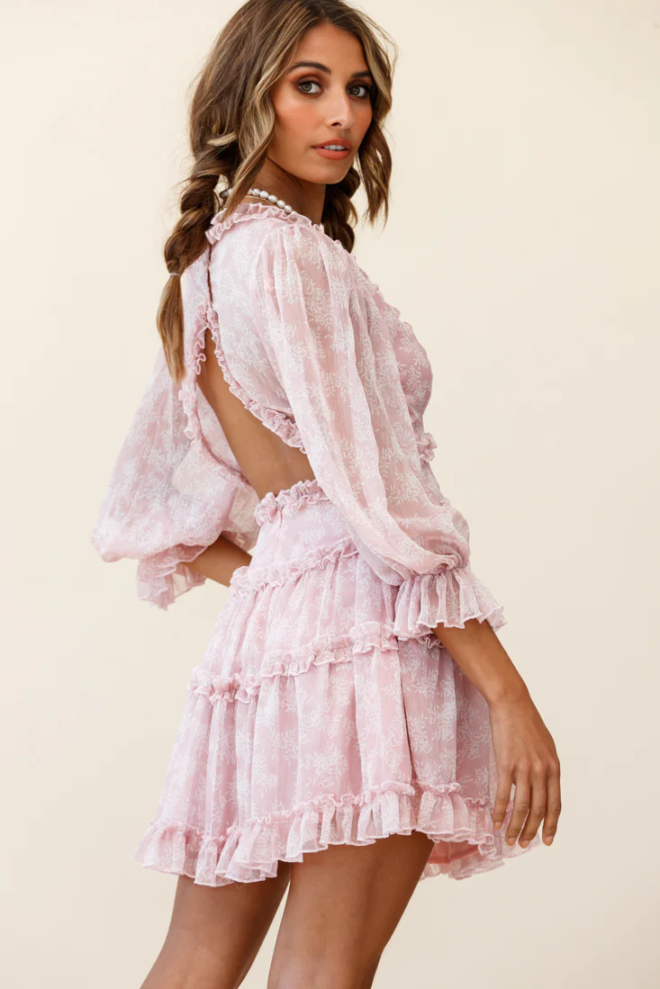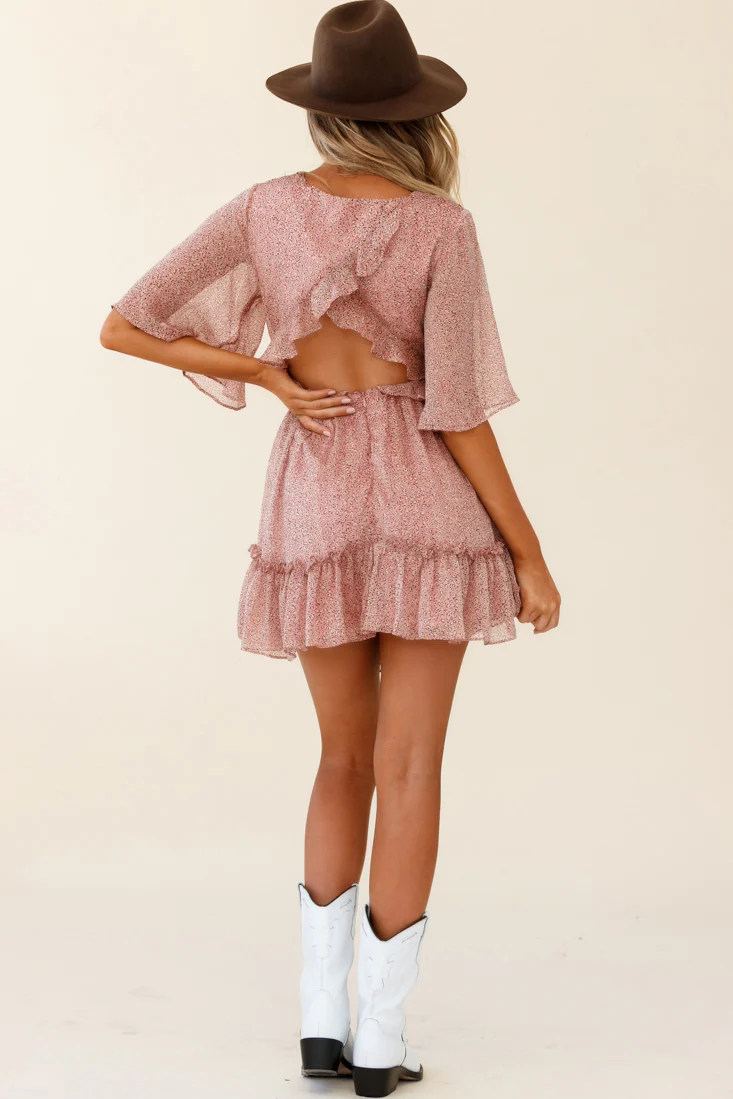 Laney Cutout Back Ruffle Trim Dress Leaves Print Pink
