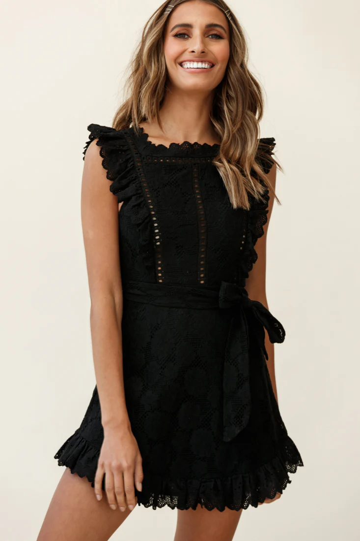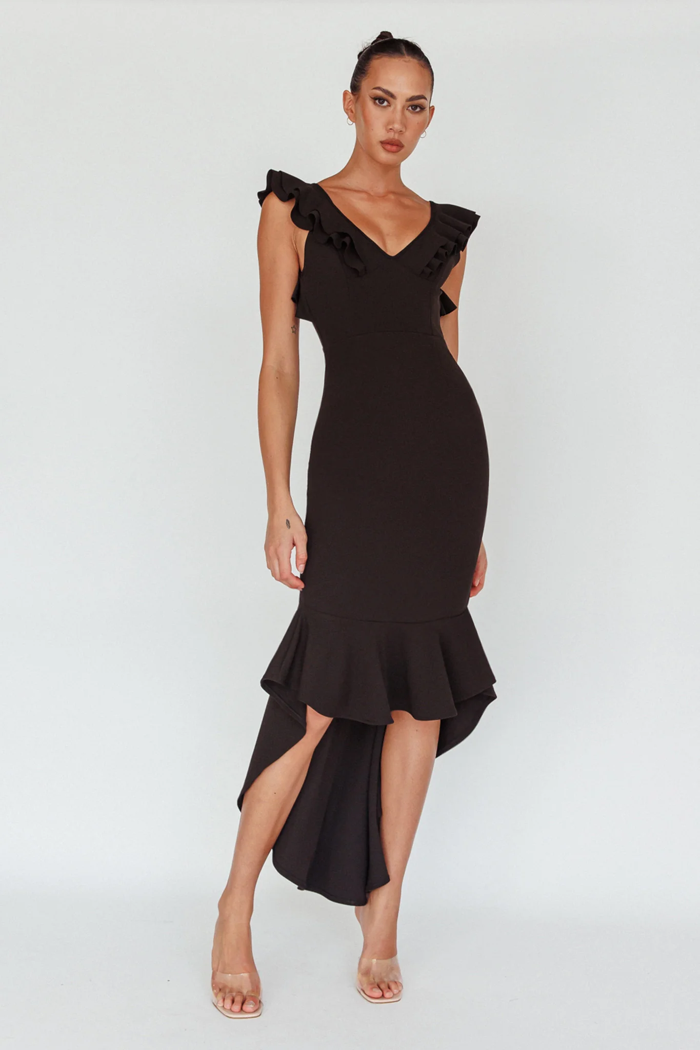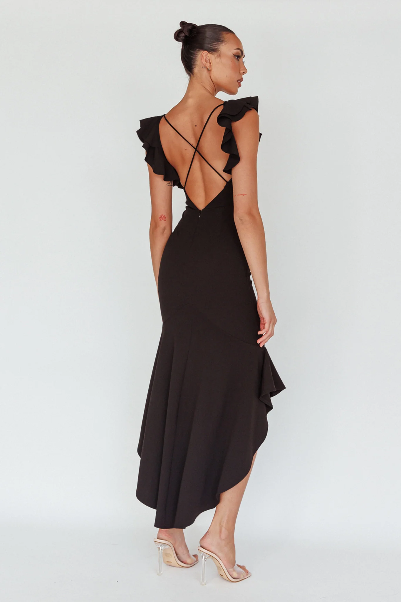 Pearl Ruffle Strap High-Low Hem Dress Black