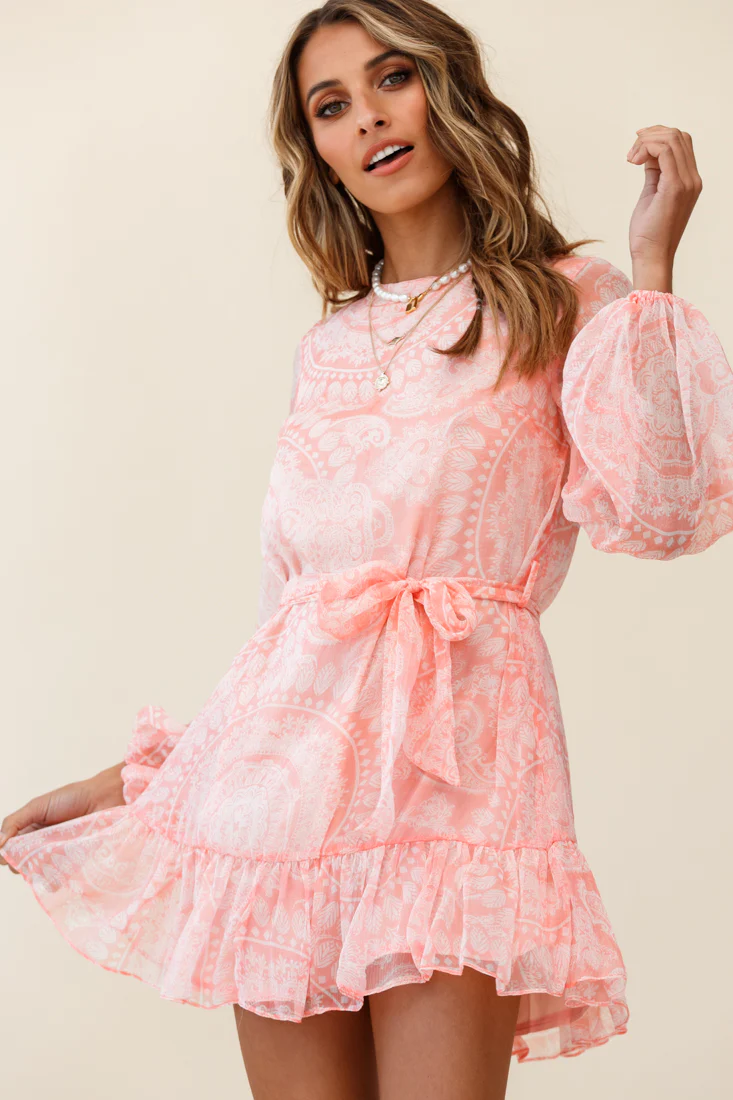 Always & Forever Long Balloon Sleeve Crew Neck Dress Paisley Print Peach