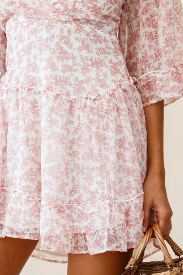 Starlight Balloon Sleeve Layered Frill Dress Floral Print White