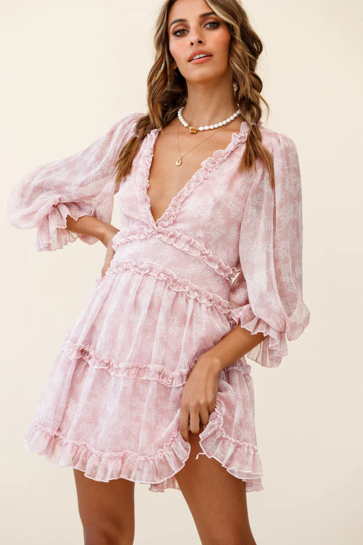 Albany Lace Up Back Frill Dress Tiny Floral Print Pink