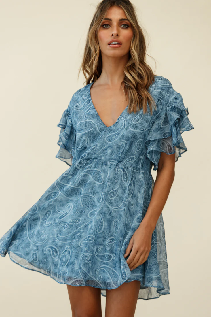 Here And Now Layered Ruffle Sleeve Loose Fit Dress Paisley Print Navy
