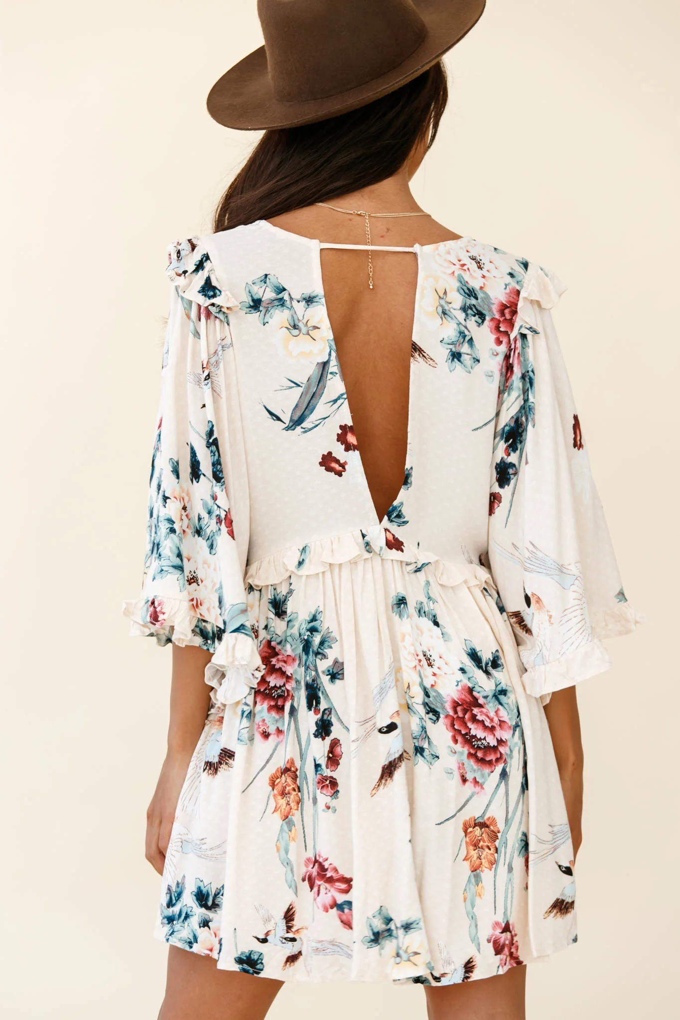Forever Sunshine Flared Sleeve Waist Tie Dress Floral Print Nude