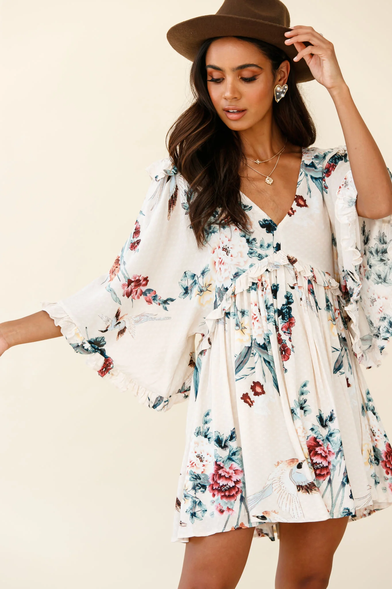 Lynette Loose Fit Angel Sleeve Dress Botanic Print Nude