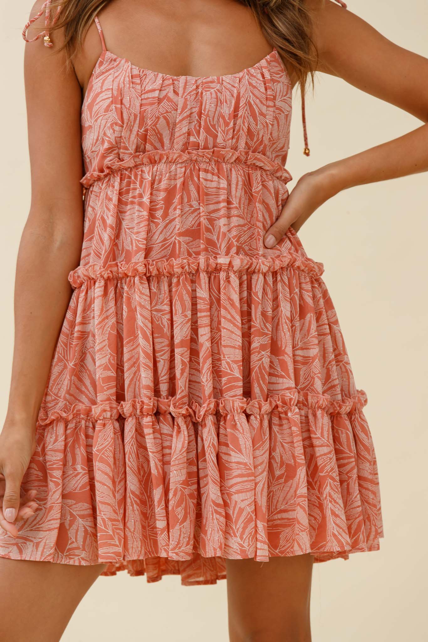 Rumi String Tie Babydoll Dress Leaf Print Pink