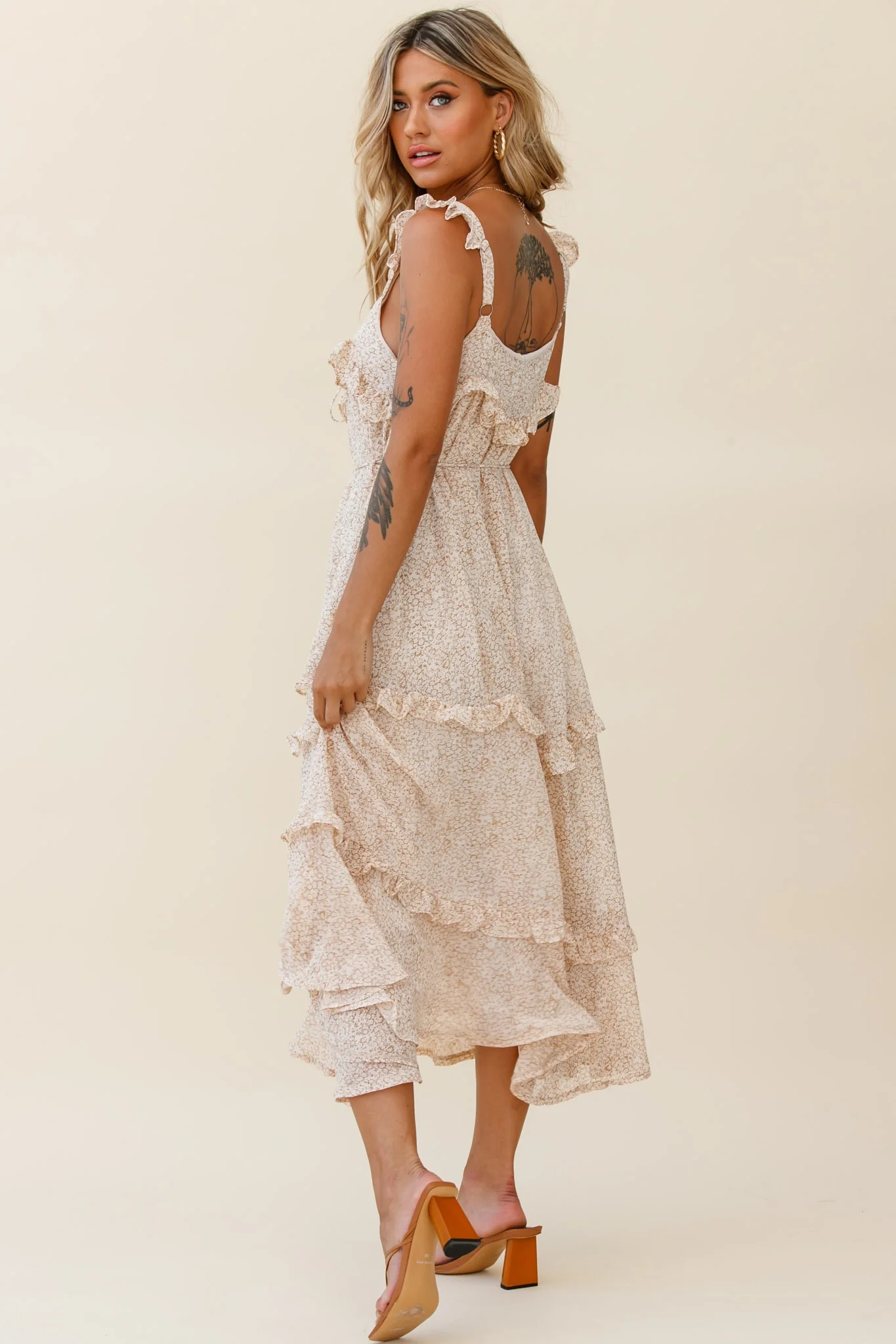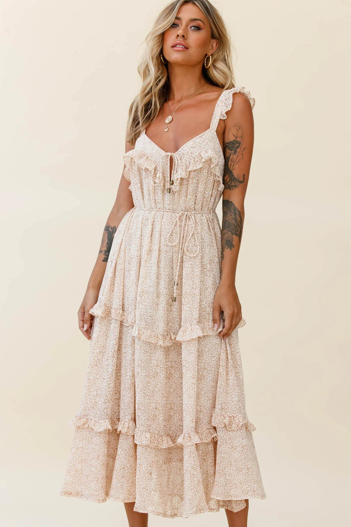 Priscilla Frill Detail Maxi Dress Floral Print Beige
