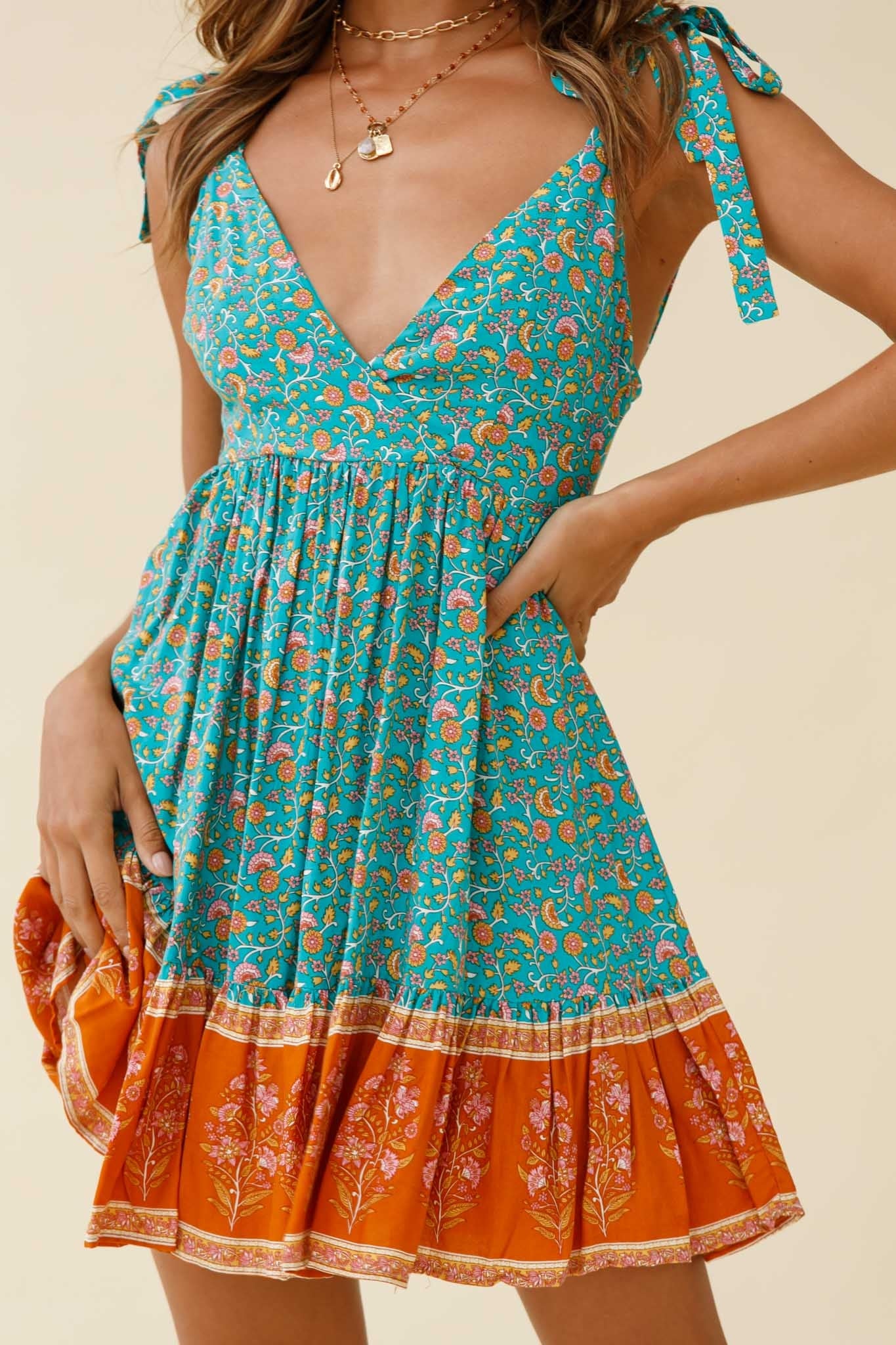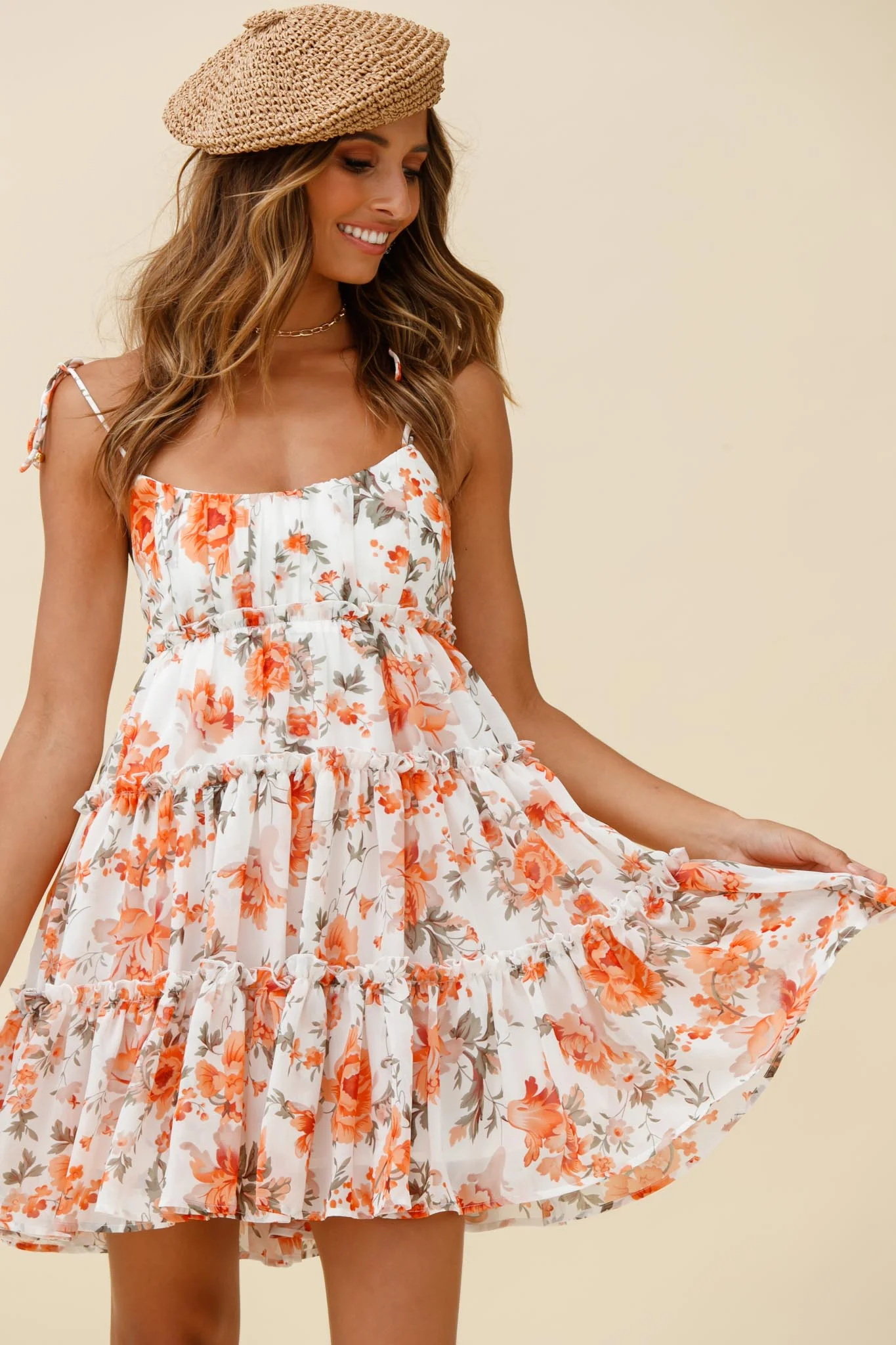 Rumi String Tie Babydoll Dress Floral Print Orange