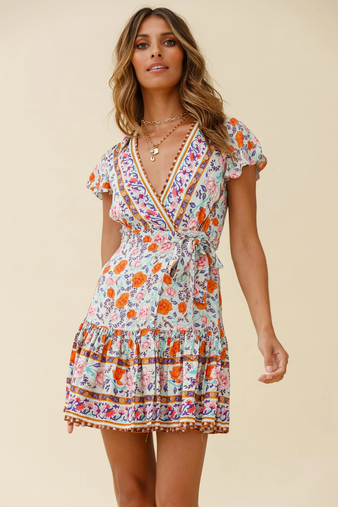 Mayan Angel Sleeve Waist Tie Wrap Dress Floral Print Mint/Pink