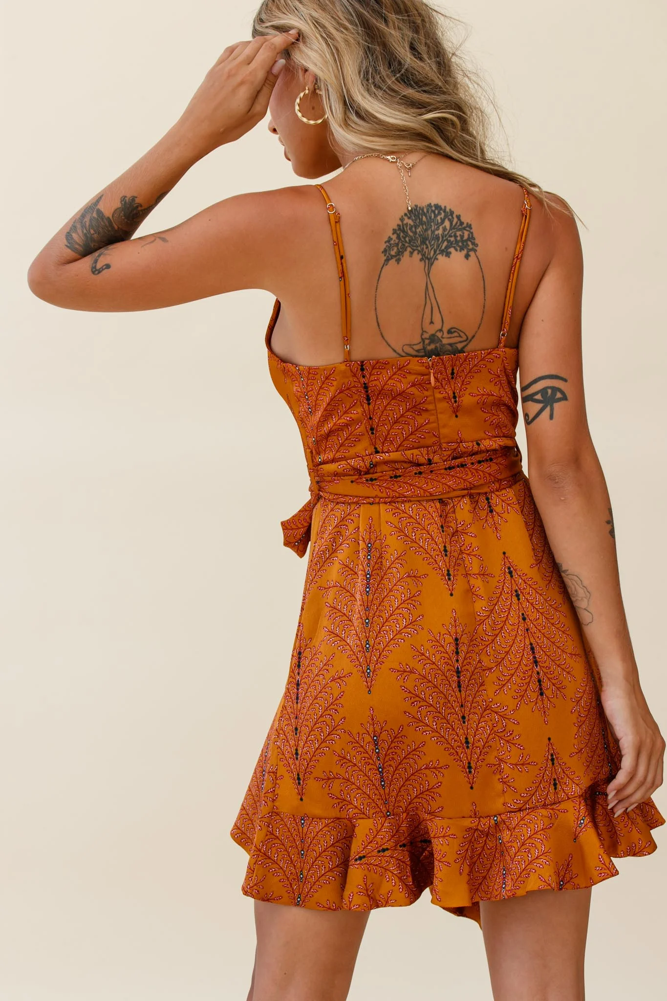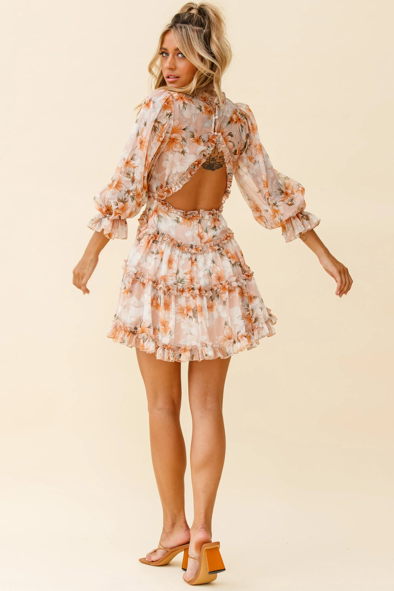 Laney Cutout Back Frill Trim Dress Hibiscus Print Nude