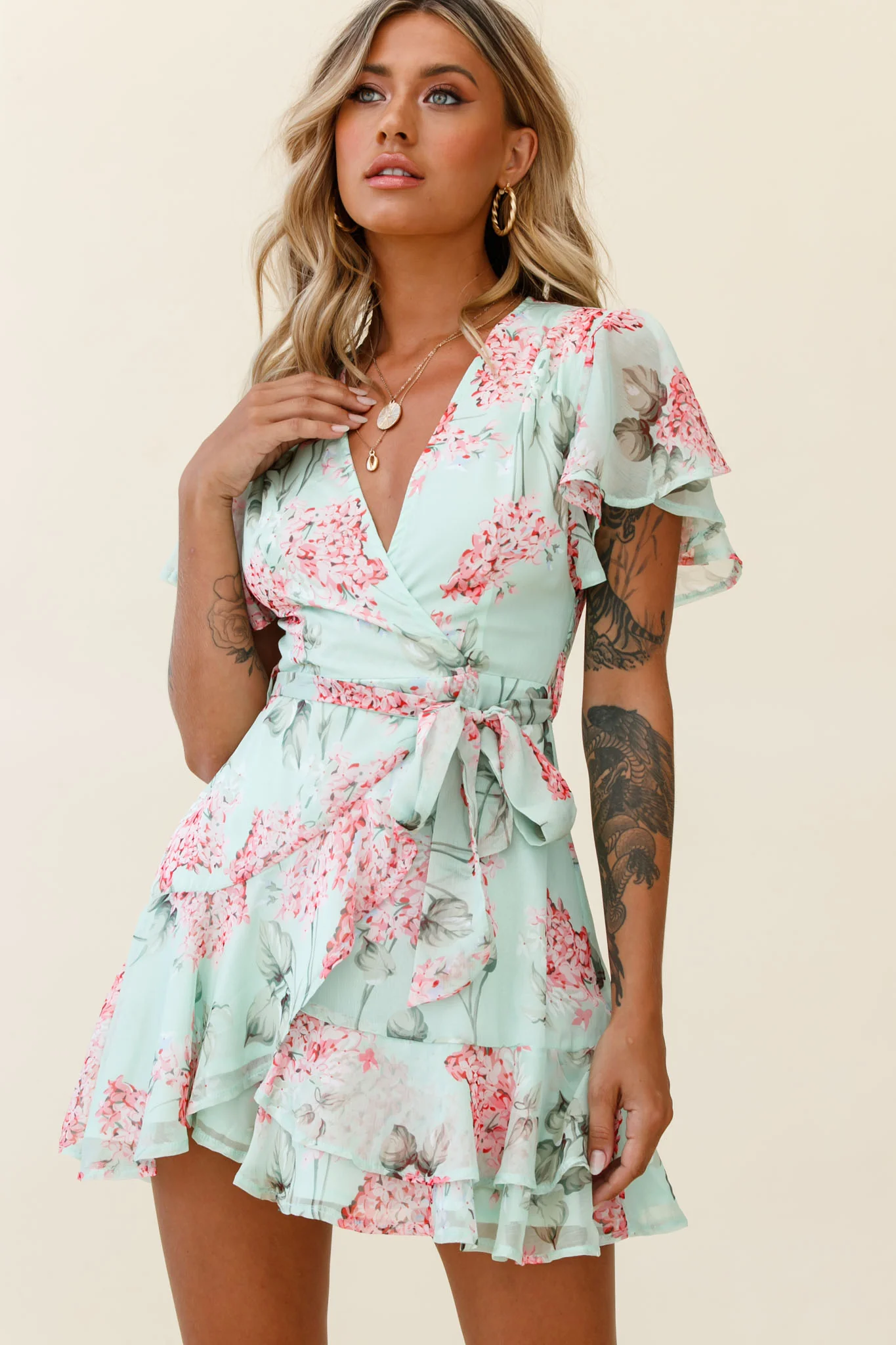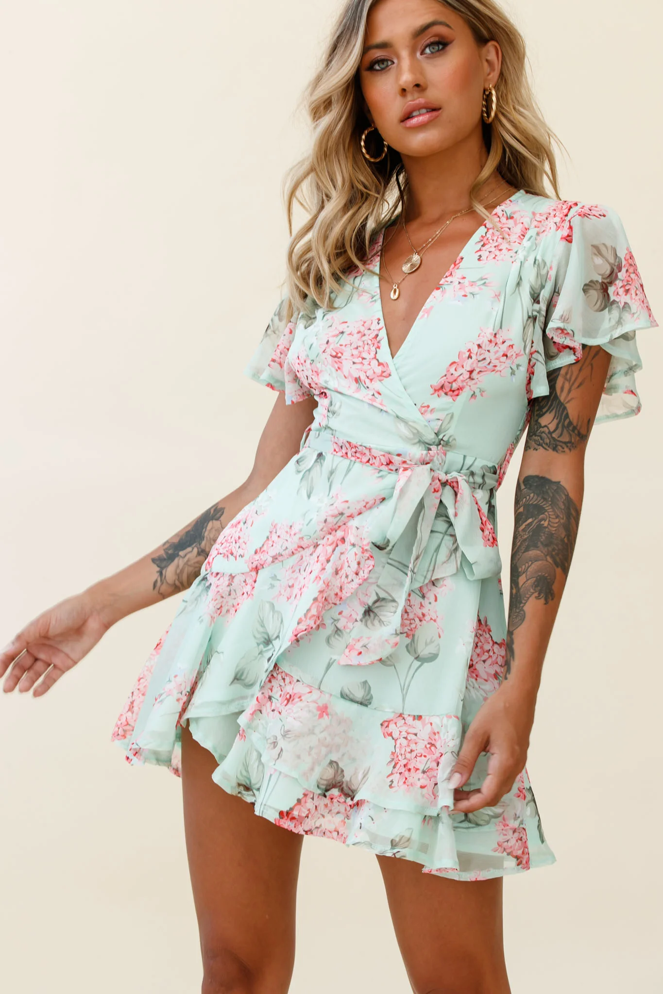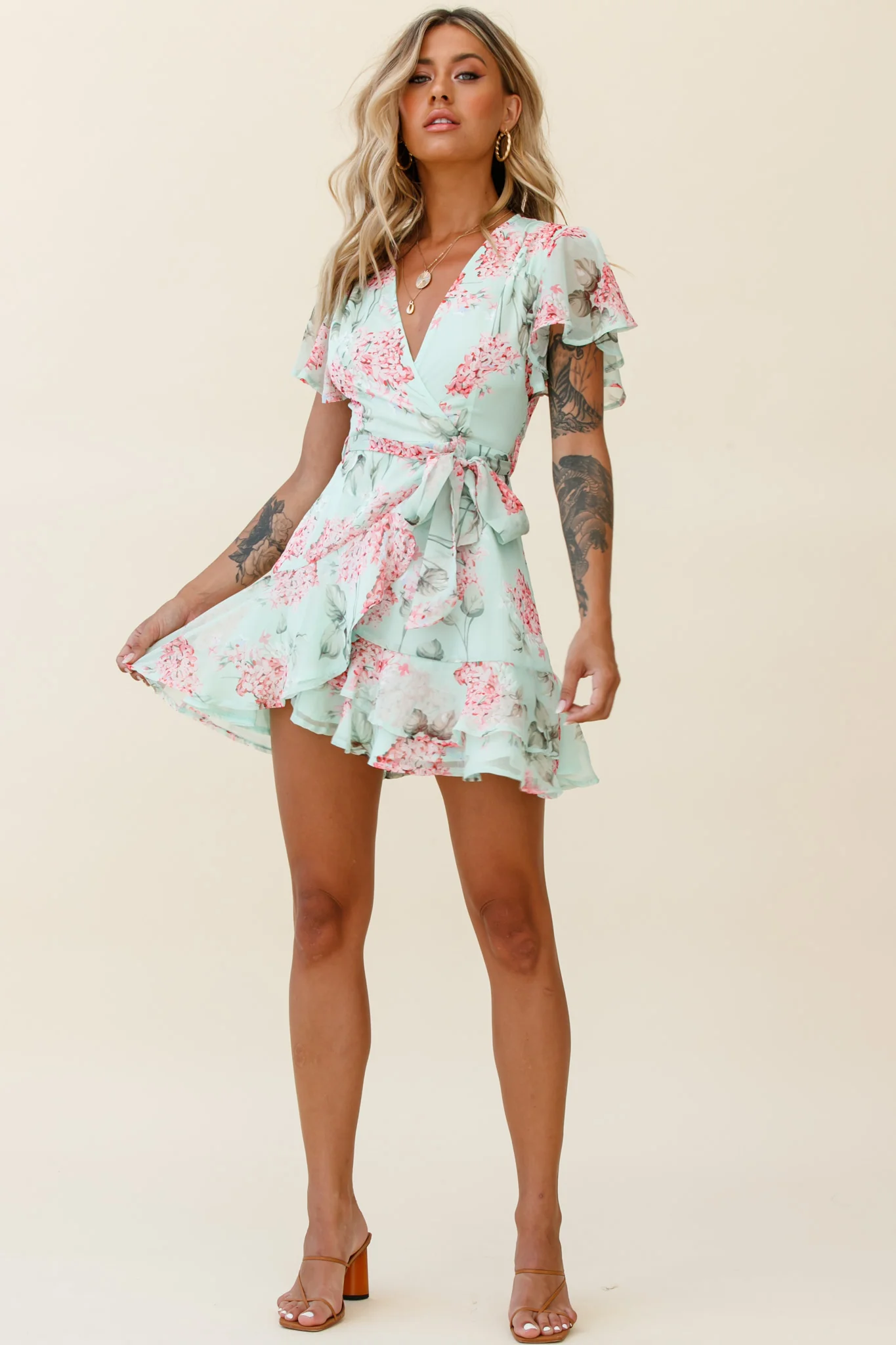 Cami Angel Sleeve Faux Wrap Dress Hydrangea Print Mint/Pink