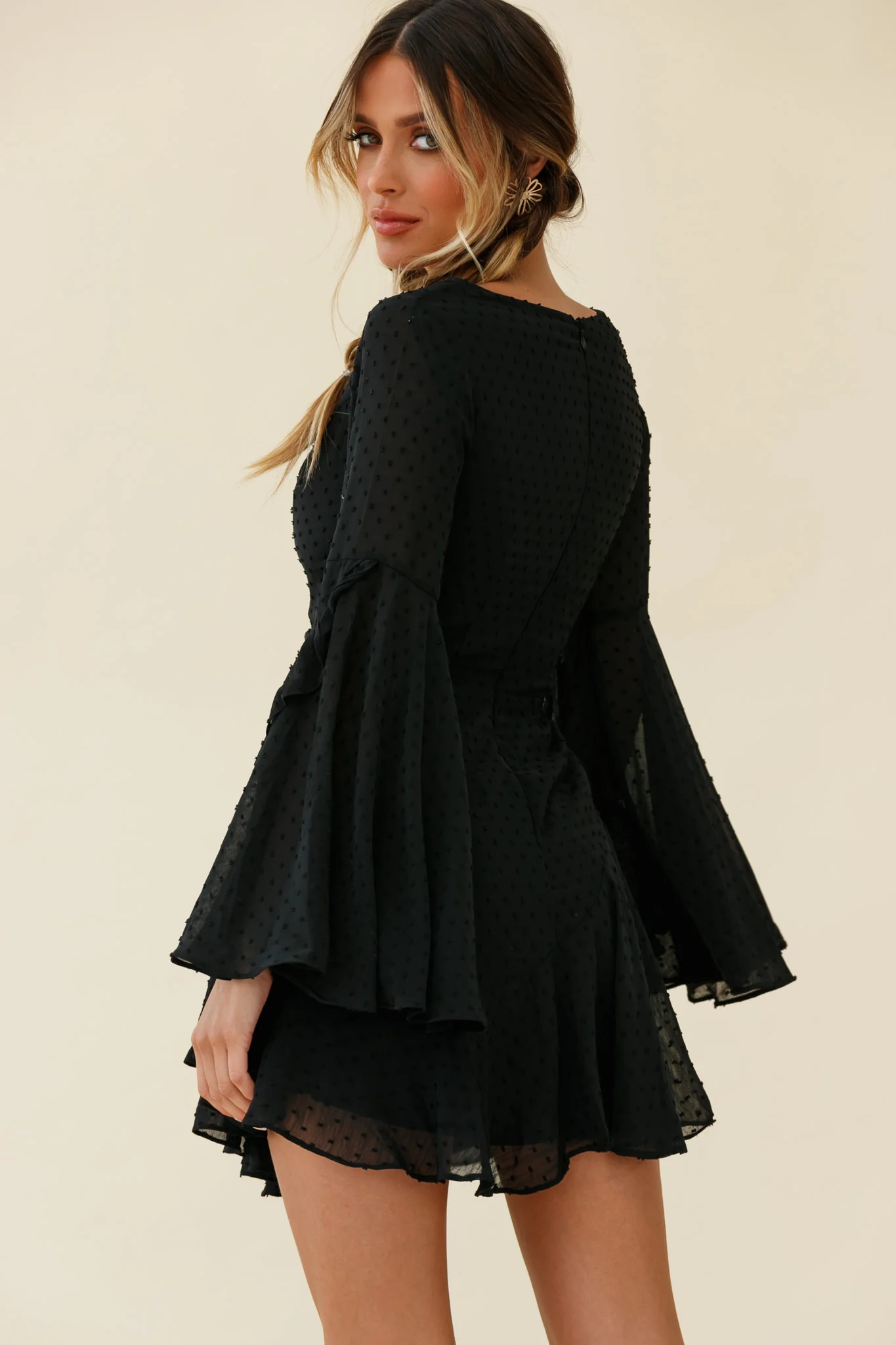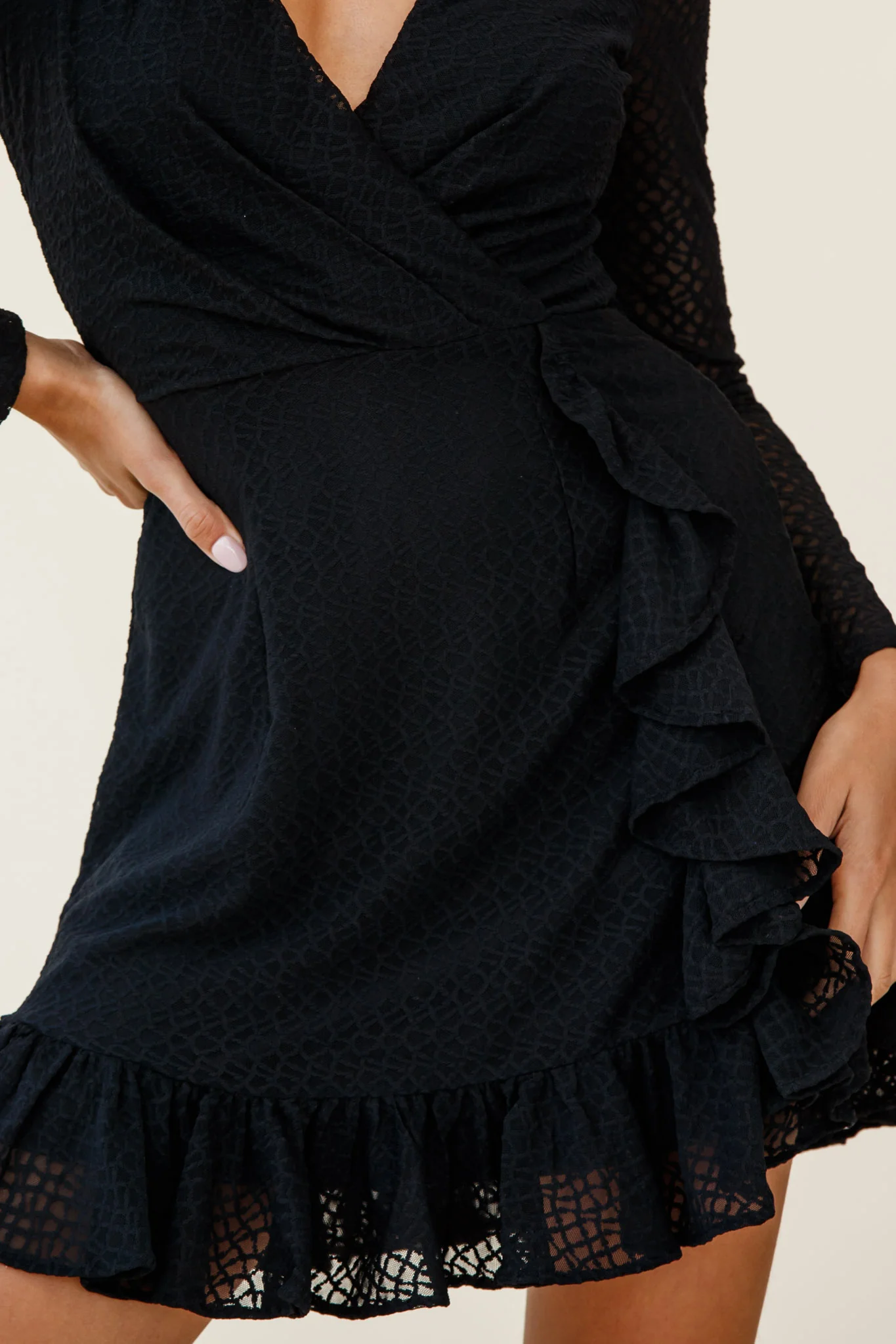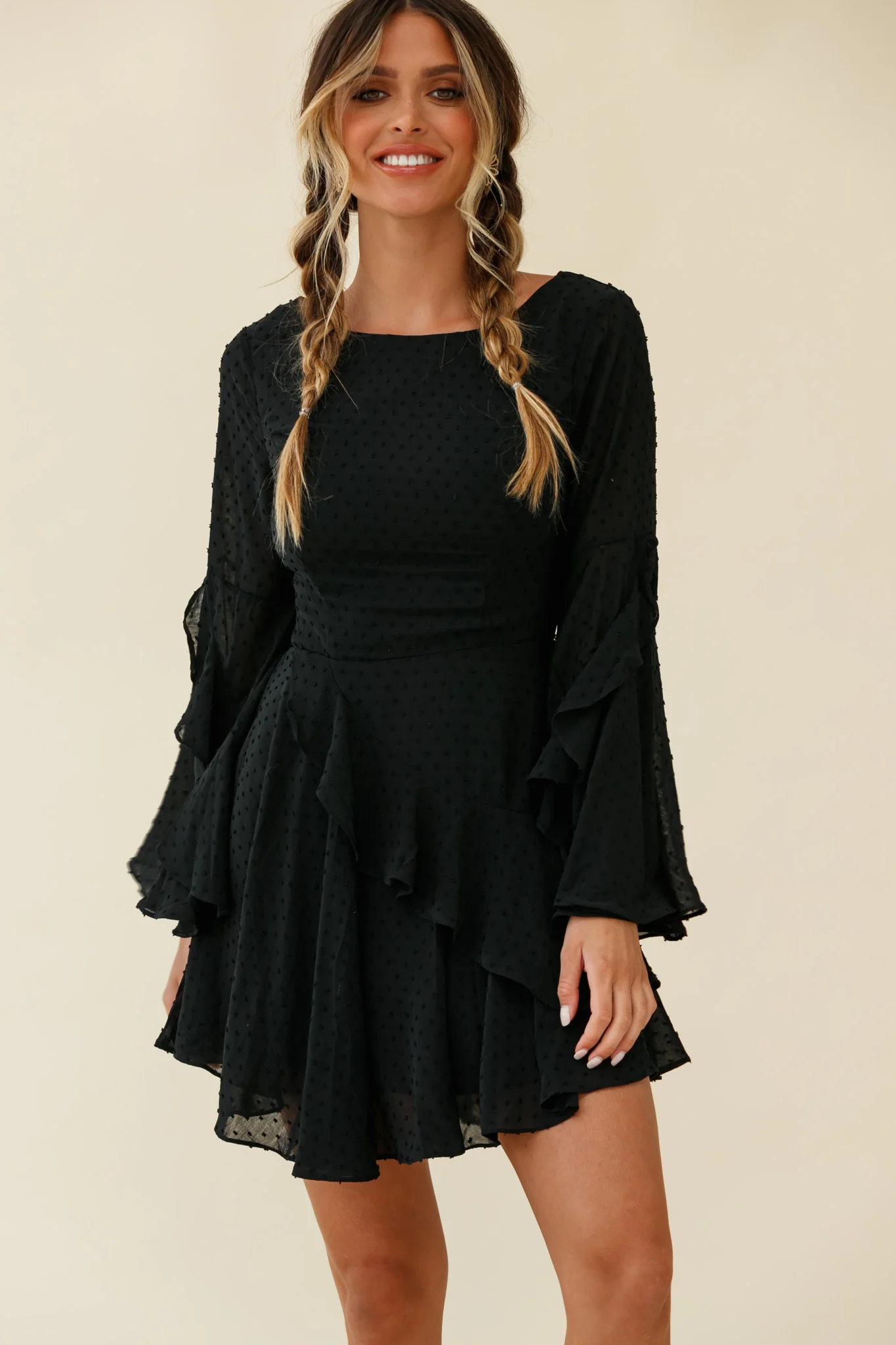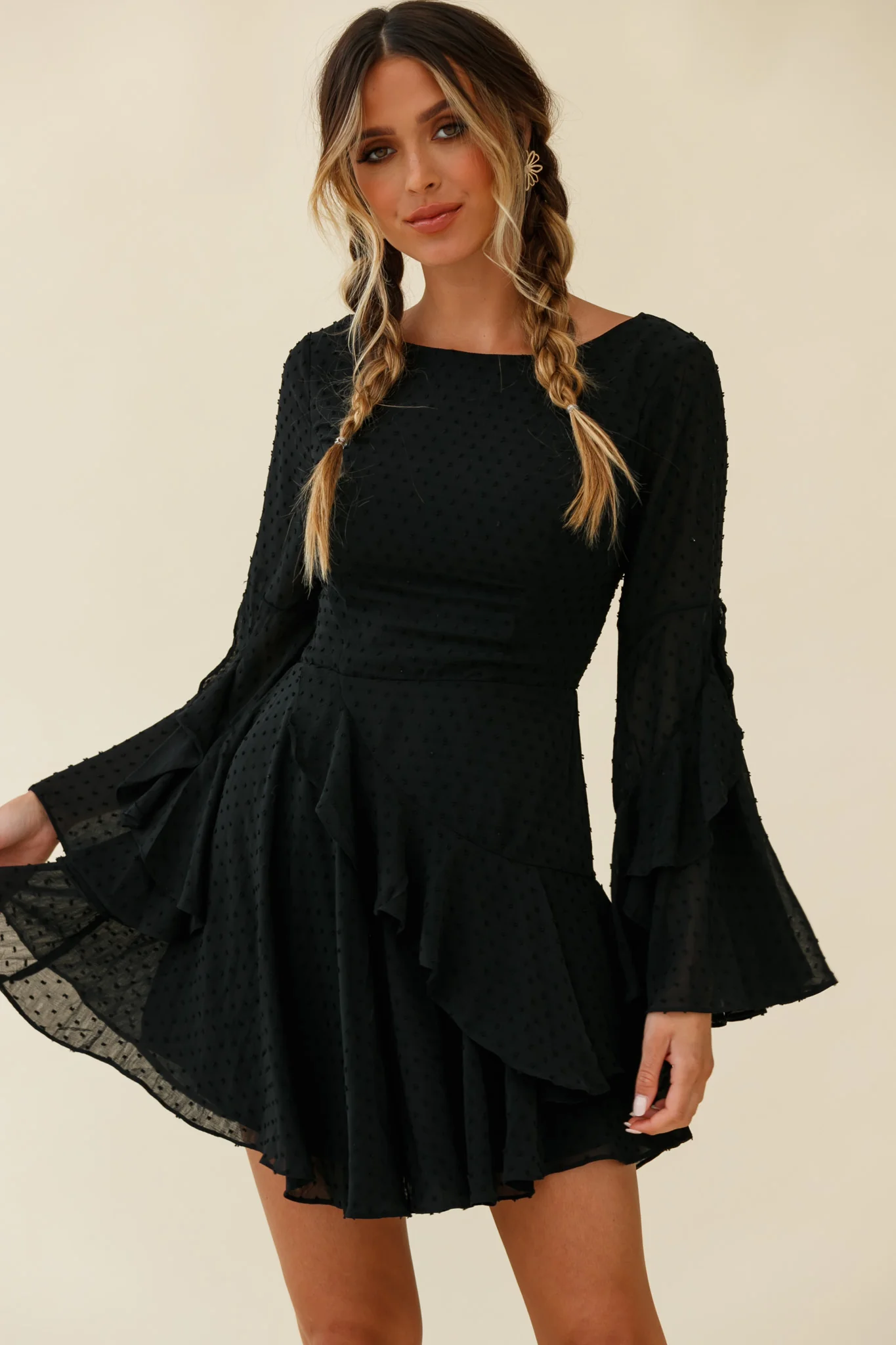 Madonna Long Sleeve Ruffle Trim Embroidered Dress Black