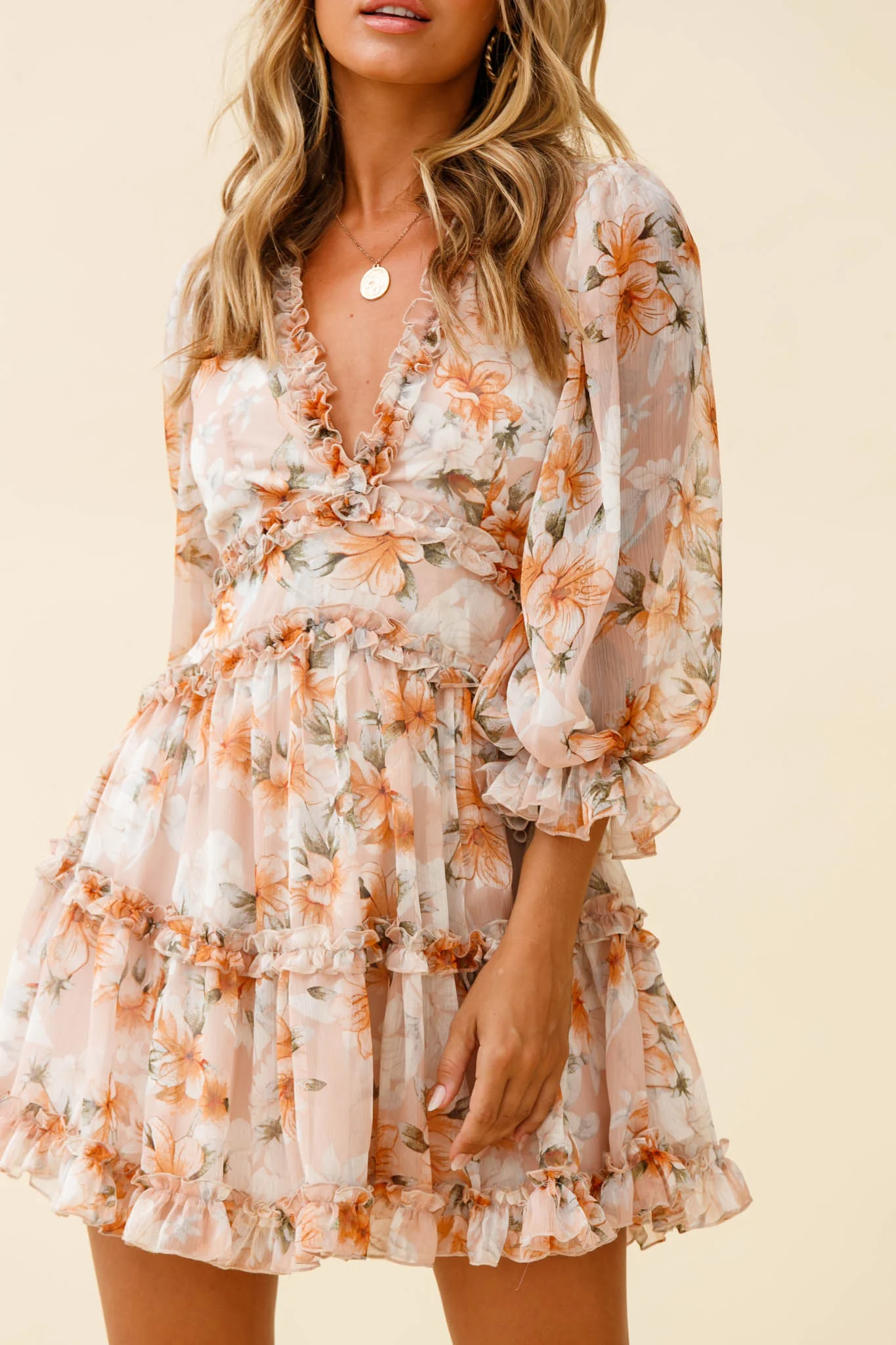 She Knows Puff Sleeve Ruffle Trim Dress Botanic Print Nude