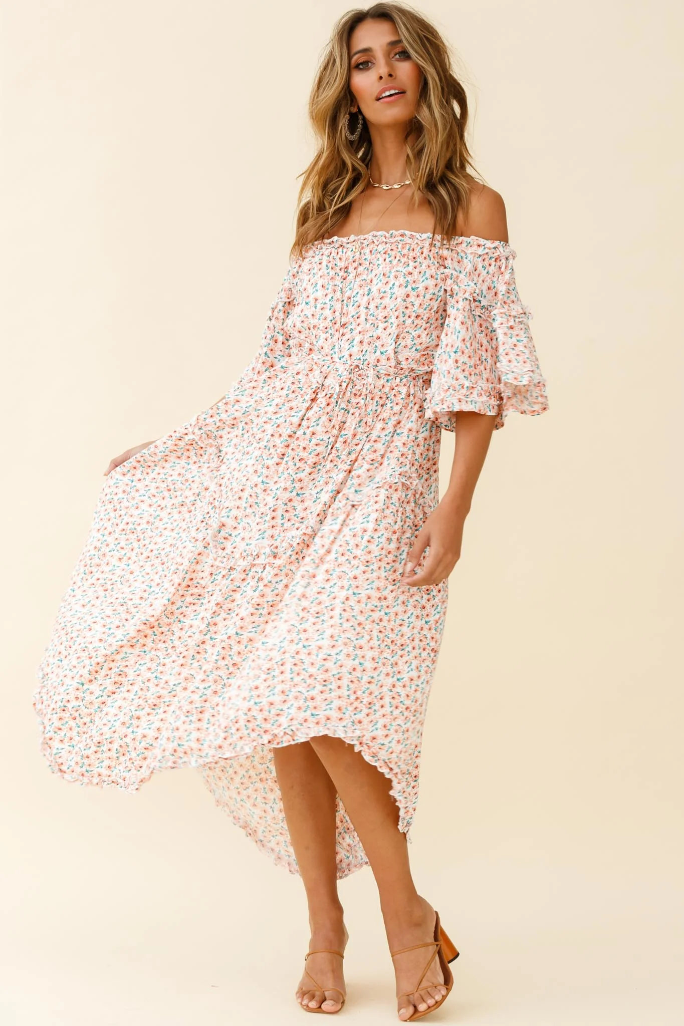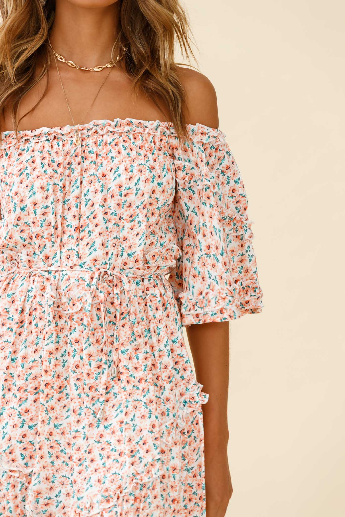 Renoir Off-Shoulder Frill Trim Dress Floral Print Pink
