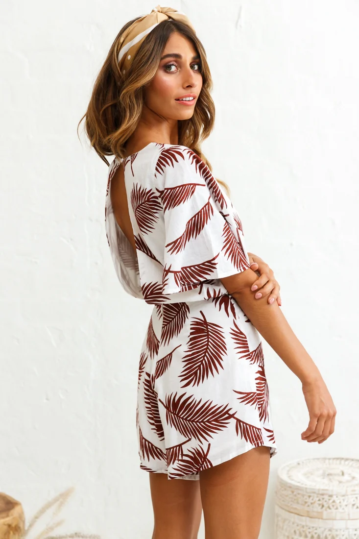 Nadi V-Neckline Wrap Romper Palm Print Wine