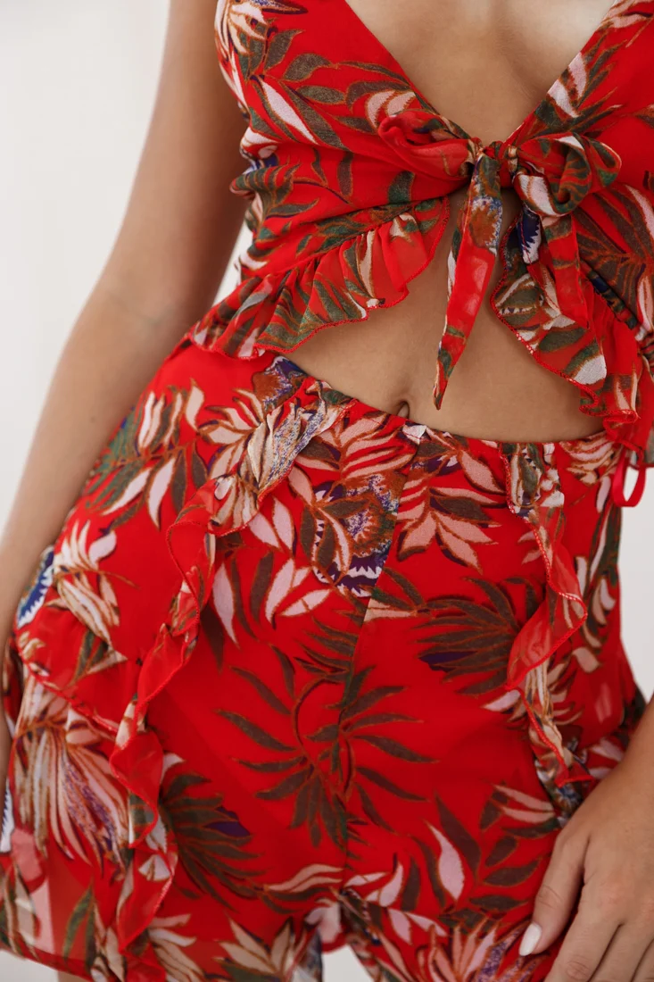 Cancun Cut-Out Bust Tie Romper Tropical Print Red