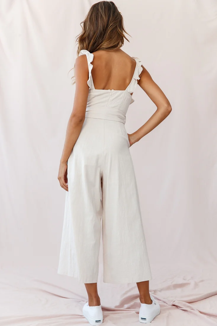 Kaia Ruffle Strap Wide-Leg Capri Jumpsuit Beige