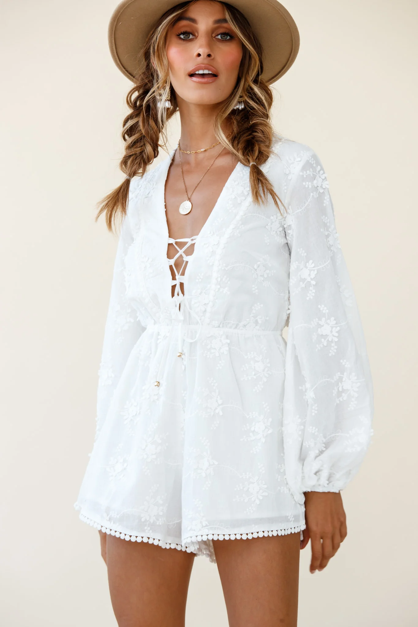 Esperanza Long Balloon Sleeve Floral Embroidery Romper White
