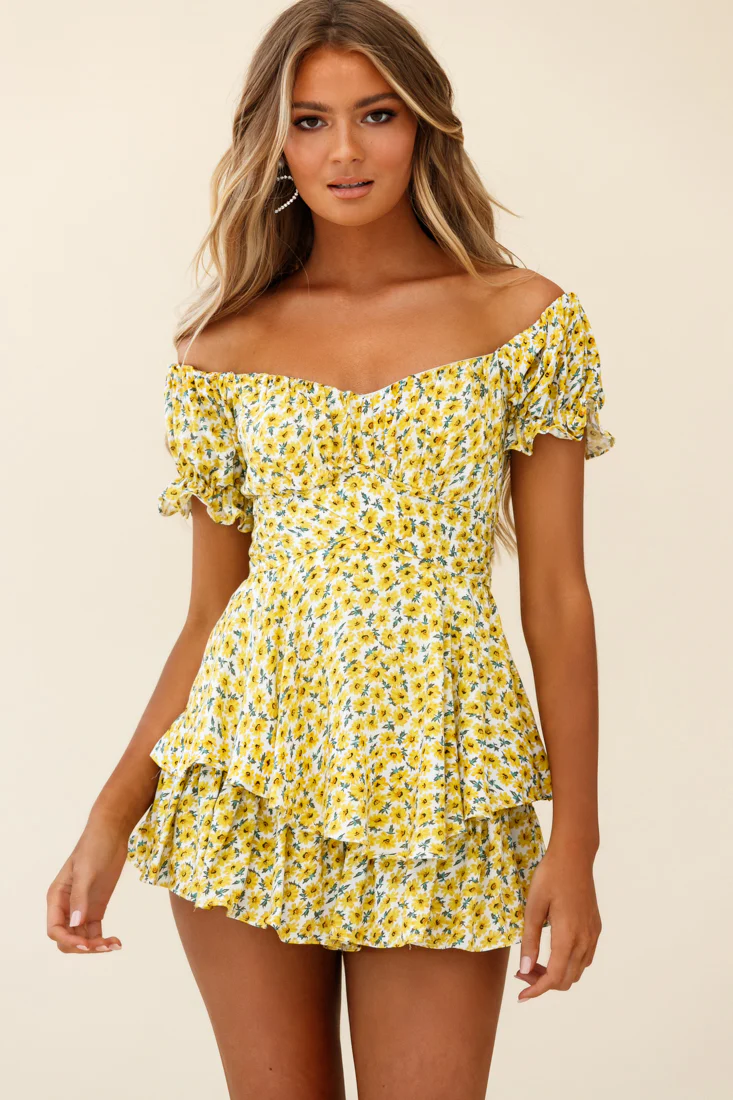 Linka Off-Shoulder Tie Back Romper Sunflower Print Yellow