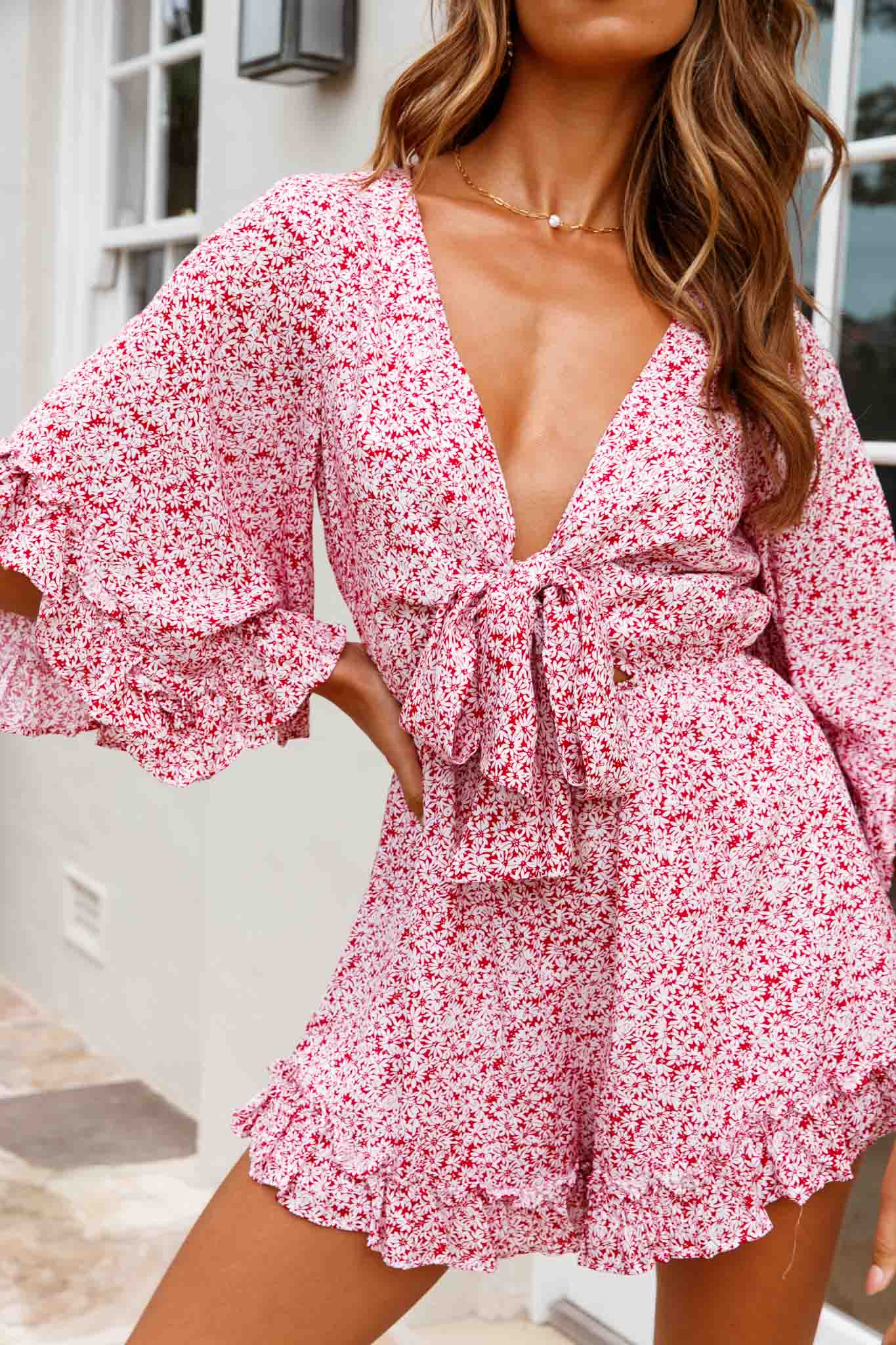 Athira Tied Bust Flared Sleeve Frill Romper Floral Print Red
