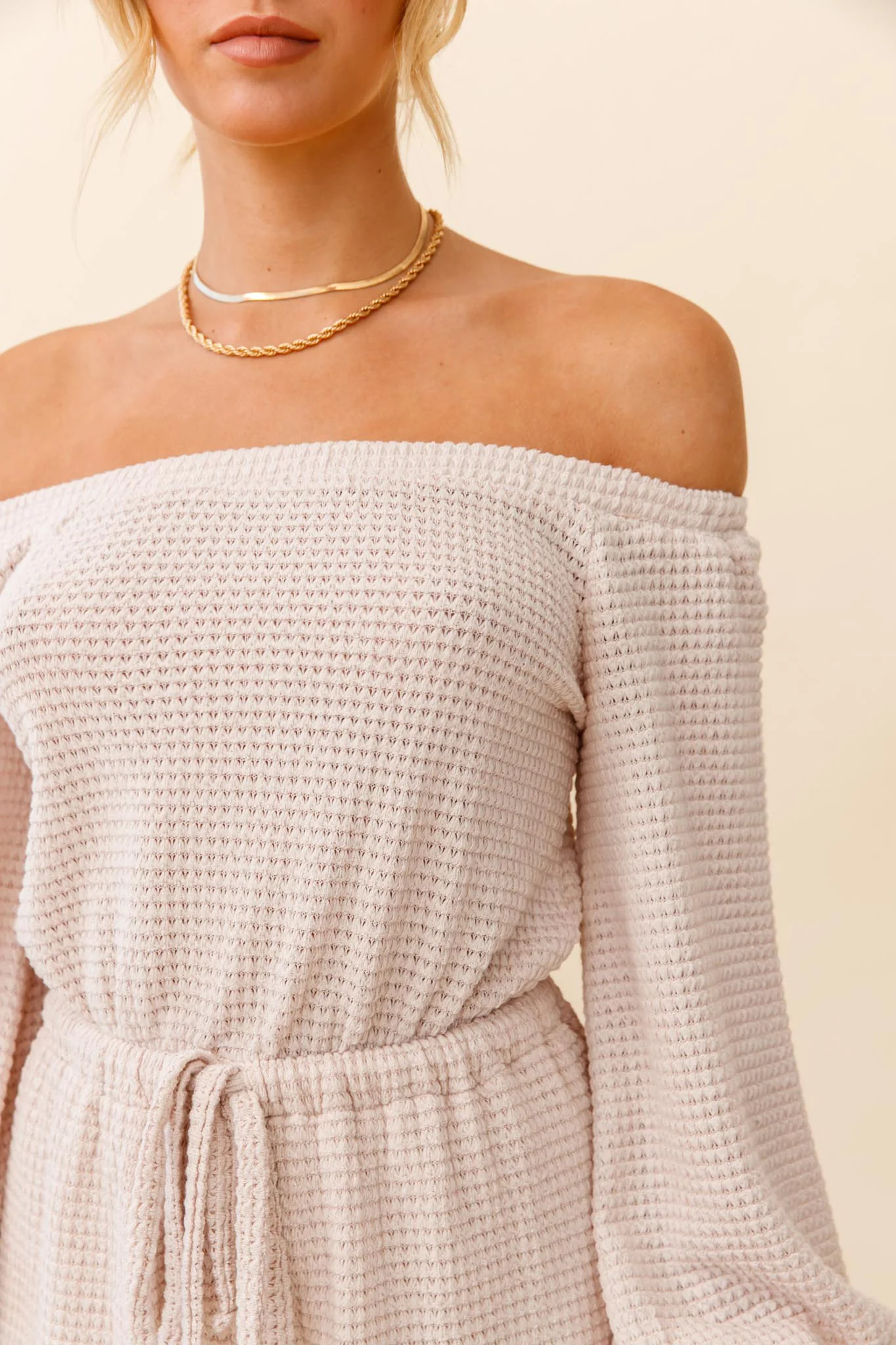 Sticks And Stones Off-Shoulder Drawstring Waist Romper Beige