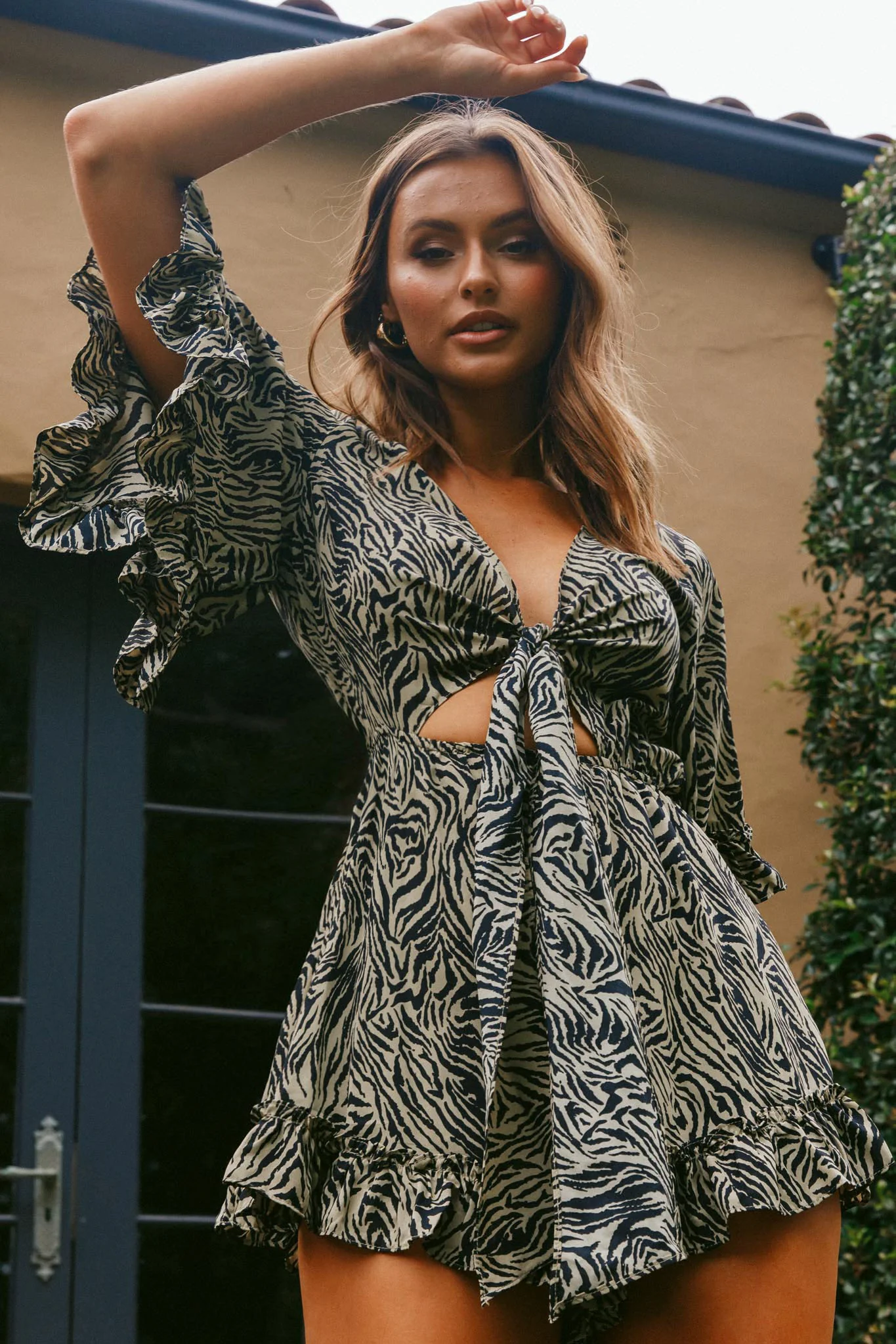 Athira Tied Bust Flared Sleeve Romper Zebra Print Black/Olive