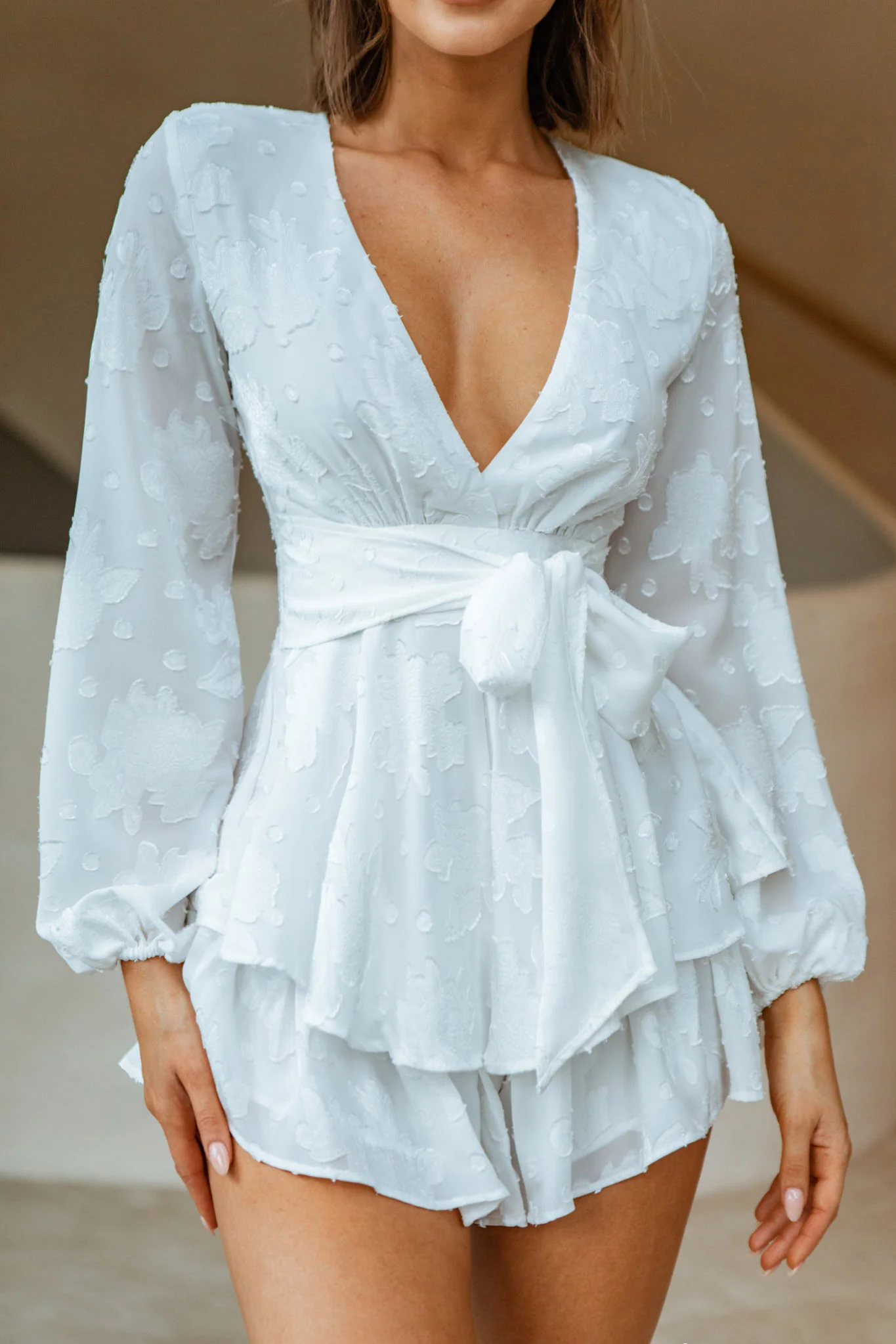 Spring Fling Frill Trim Waist Tie Lace Romper White