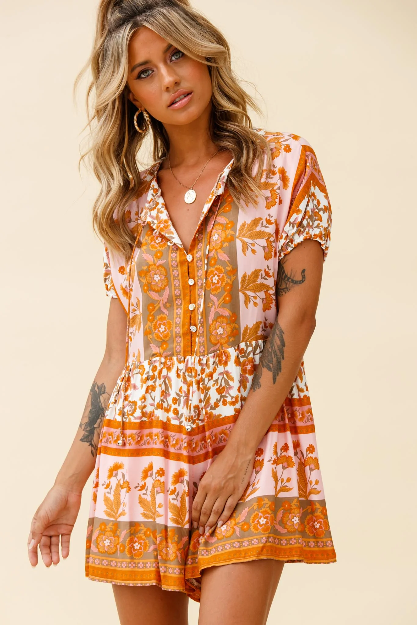 Time Flies Puff Sleeve T-Shirt Romper Boho Floral Print Yellow