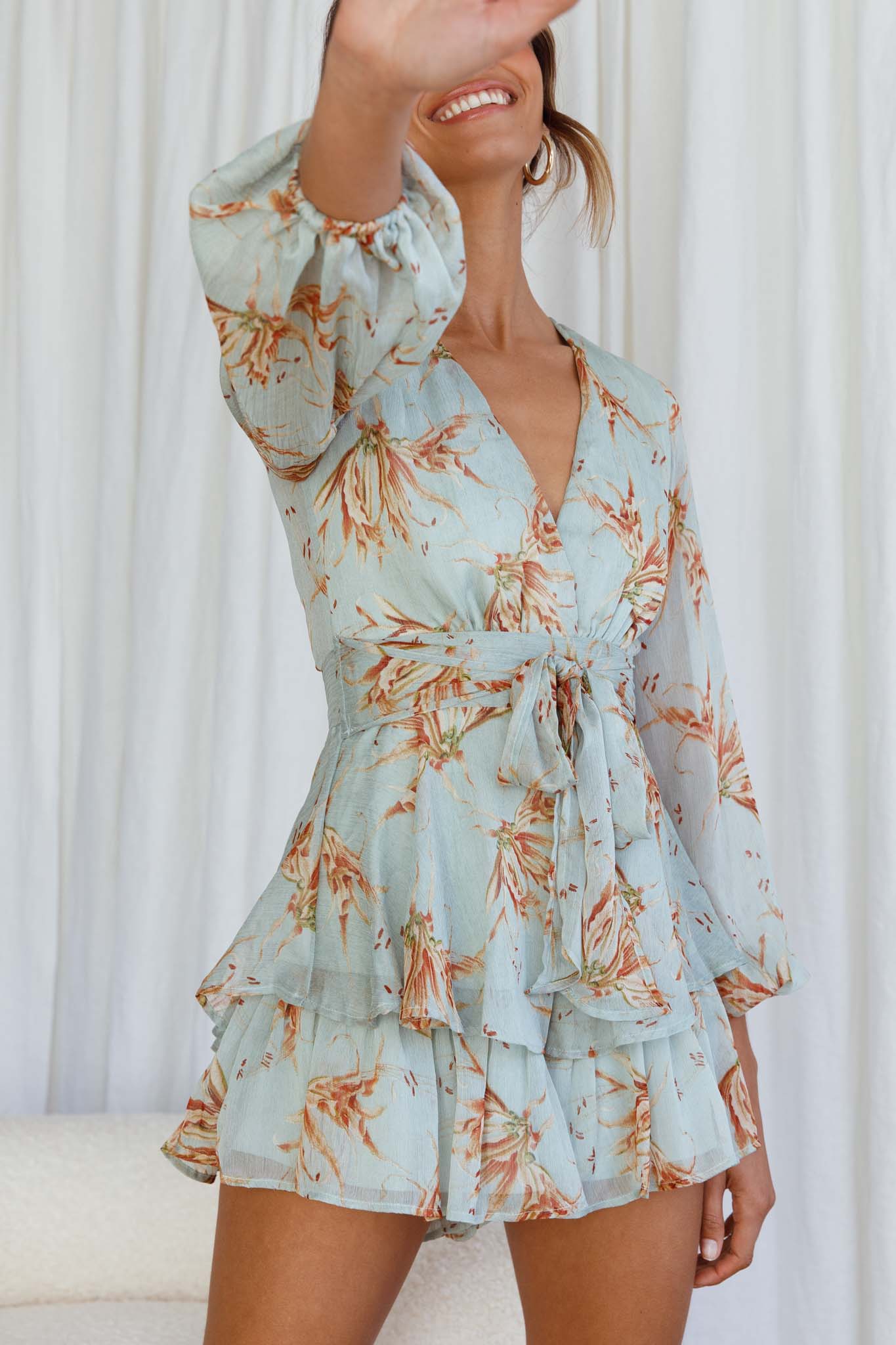 Maddox Fit & Flare Long Sleeve Romper Lily Print Pistachio
