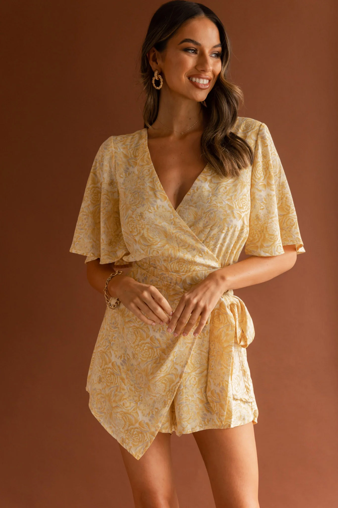 Nadi V-Neckline Wrap Romper Rose Flower Print Yellow