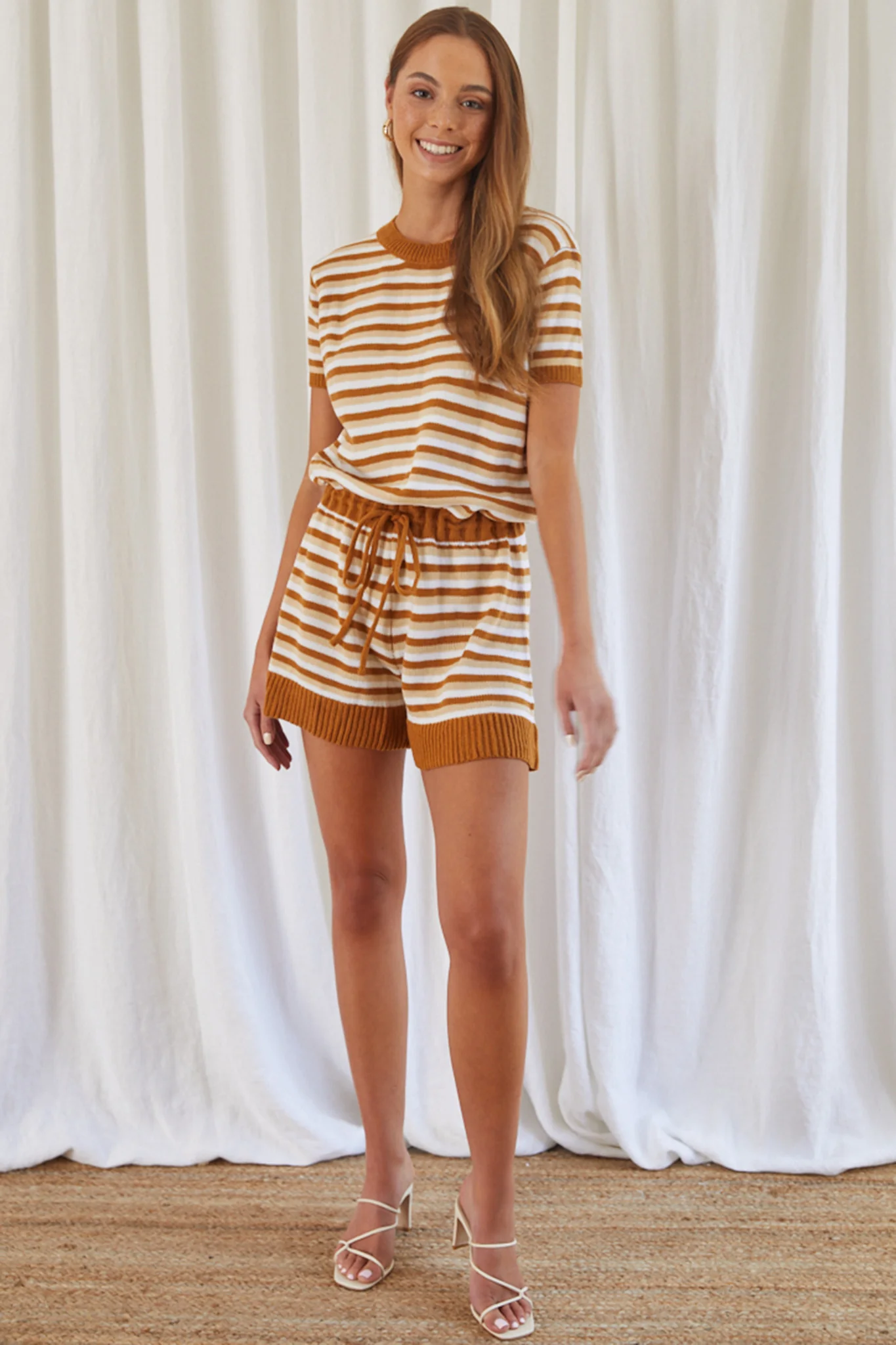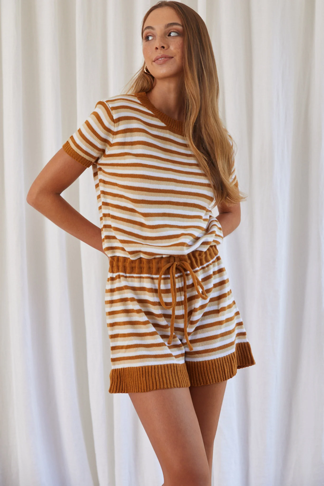 Amris Off-Shoulder Long Sleeve Knit Romper Camel