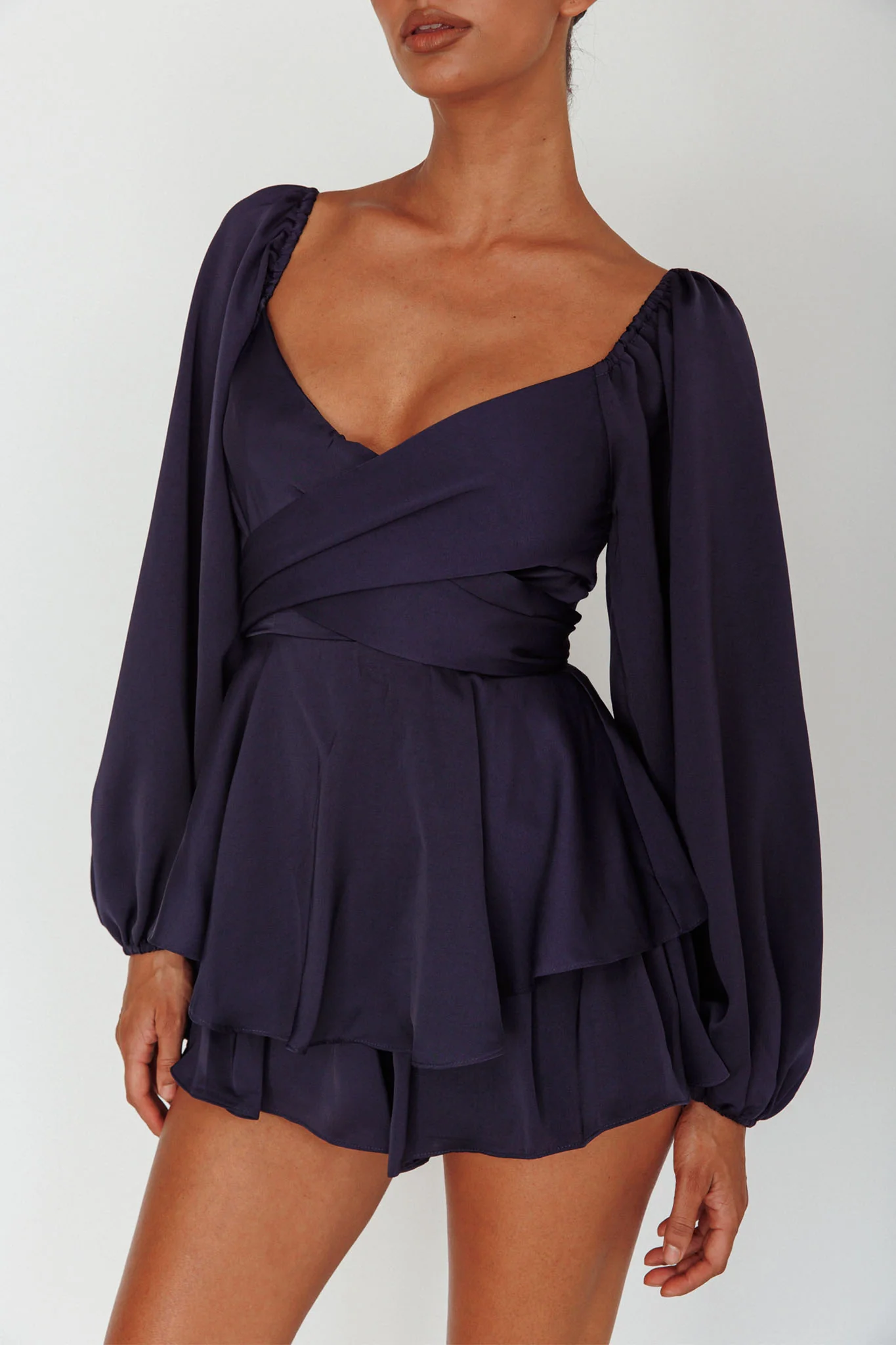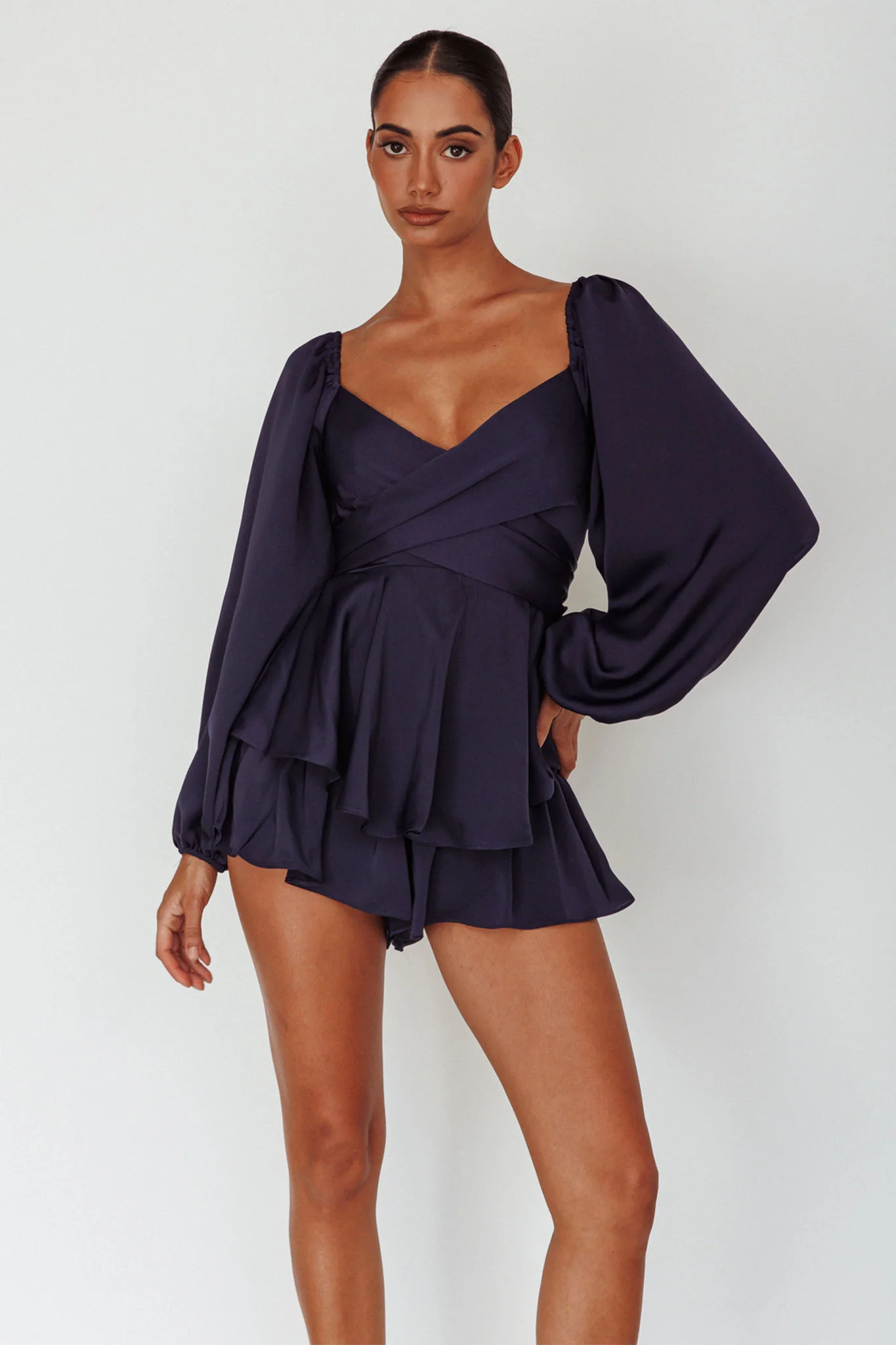 California Girl Lantern Sleeve Waist Tie Romper Blue